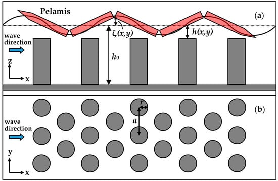 Schematic plot of a triangular lattice of identical, vertical, rigid circular cylinders standing in a sea bottom. The lattice constant is a and the cylinder radius is r. (a) The x-z side-view. (b) The x-y top-view. An example of the Pelamis sea wave energy conversion (SWEC) device is depicted to show the intended deployment.