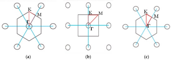 It is now well known that when the incident water wave enters the non-uniform media area, it would be scattered (or diffracted) by the structures to produce the multiple scattering phenomenon. The transmission properties of water waves through artificial crystals can be obtained from the calculated transmission wave. Three lattice types are considered, i.e., triangular, square and hexagonal lattice arrays. The ΓK or ΓM direction of the lattice structure is set to be parallel to the incident wave side, as shown in Figure 2, where Γ, M, and K are the points of the first Brillouin zone in the irreducible representations of the corresponding symmetry groups. For a concrete example, a triangular lattice with the lattice constant a is considered. The k-point inside the irreducible Brillouin zone is derived by walking from Γ (0, 0) to M (0, 0.5) π/a to K (1/3, −1/3) π/a and back to Γ. Any arbitrary wavevector can be constructed by linear combinations of these basis vectors.