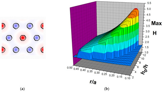 Triangular structure: (a) The spatial distributions of the wave amplitude in the ΓK direction. (b) The maximum wave amplitude as functions of the ratio h0/h and the ratio r/a.