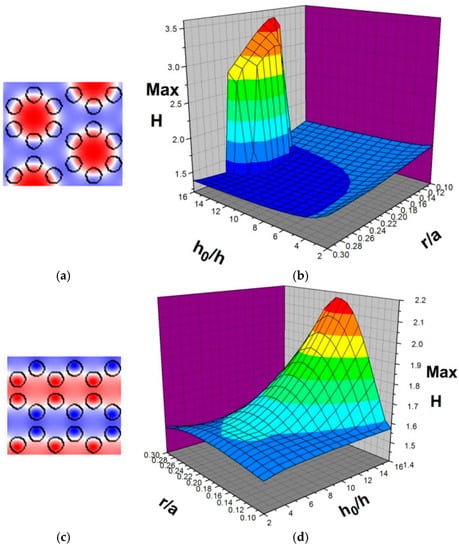 Similarly, consider the transmission of water waves across the hexagonal lattice structure, which is derived by putting cylinders at the vertices of a hexagon, shown in Figure 5. In Figure 5a,b and Figure 5c,d, the incident waves are along the ΓK and ΓM directions, respectively. In both cases, the simulation results indicate effective wave enhancement phenomena. However, the concentration regions are different for different incident directions. Figure 5b,d present the results for the maximum wave amplitude dependence on h0/h and r/a in the ranges of 2~16 and 0.1~0.3, respectively. For the ΓK direction, it is clear that the enhancement factor is only higher and limited in regions for h0/h and r/a, being from 14 to 16 and from 0.15 to 0.24, respectively. On the other hand, for the ΓM direction, the enhancement factor increases smoothly with the values of h0/h and r/a.