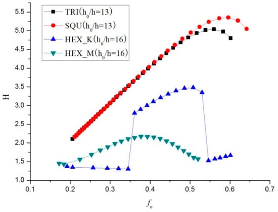 Next, the dependence of H on fn for the three lattice types is displayed in Figure 6. The four curves correspond to different lattice types with different values of h0/h. We can see that the largest H of 5.3 occurs at fn = 0.6 in the square structure. At low frequencies, the wave interference is not obvious for any given lattice type so the enhancement is not significant. It can be seen, that larger H appears when fn is larger than 0.32. Overall, the H for the hexagonal lattice type is appreciably less as compared to the other two.
