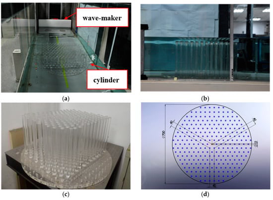 The under-water periodic structure consists of solid circular cylinders forming a triangular lattice mounted on the bottom of the water tank (Figure 7c,d). We arrange the cylinders with a lattice constant a = 4 cm in 35 × 35π cm2 circular area and set the ΓK direction of the structure parallel to the short side of the structure. The radius of cylinder r is 1 cm and the length of cylinder L is 24 cm. The structure is positioned on the central line of the wave-tank at a distance of 120 cm from the wave-maker and 300 cm from the wave absorbing area.