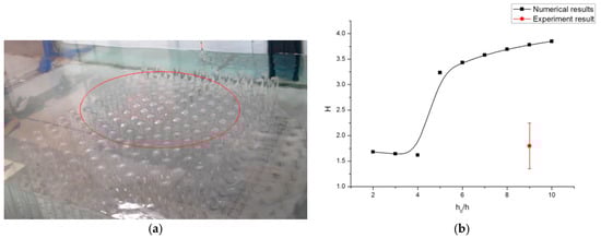 To demonstrate the predicted enhancement of water wave amplitude, we have designed and conducted a reduced-scale laboratory experiment. All the experiments were performed in a rectangular water tank with side and bottom walls made of transparent glass. The experimental set-up and the home-designed under-water periodic structure are shown in Figure 7. The water tank is 5 m in length, 0.8 m in width and 1.2 m in height mounted on the laboratory ground (Figure 7a). The principal facilities include a wave generating system, a back-wave absorber, and an image recording system. Incident plane waves are generated by a self-designed displacement piston wave-maker, which can be used stably and effectively in shallow water wave regions. The driving frequency of the wave-maker can be altered from 0.5 to 1.2 Hz. The back wave reflected from the other end of the water tank is damped by the wave-absorbing sponge beach. Both top-view and side-view images are recorded by a digital camera at running rates of 10~50 frames per second and exposure times 1~10 ms.