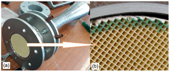 - The stack is a honeycomb stack made of a ceramic material (Celcor) characterized by a low thermal conductivity and a high specific heat. These properties enhance the stack performance in converting heat to acoustic power []. It fits the stack holder and is 8 cm long in the direction of the resonator axis (the longitudinal direction of acoustic vibration). The pores have a squared shape and are characterized by a hydraulic radius of around 0.28 mm. The cell density is near 400 cpsi. The stack placed inside the stack-holder and a magnified view of a portion of it are shown in Figure 2.