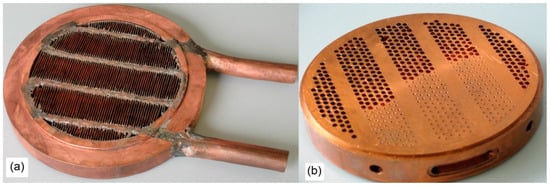 The first ambient HX (AHX1) has a rectangular pore geometry being of the fin-and-tube type. For its fabrication a copper ring 2 cm thick with an internal radius of 10.5 cm and an external radius of 14 cm has been considered as mechanical support of the HX itself. Just outside the HX the cooling water flows through a copper tube with a diameter of 14 mm which has been crushed to obtain a rectangular cross section pipe of area 2 cm × 0.5 cm. The crushed pipe has then been bent six times to allow for four passages in the front section of the HX as shown in Figure 4a. The bent segments don’t obstruct the open area of the HX since they have been inserted in compartments extracted from the ring support. The fins are made of laminated copper 0.35 mm thick and are spaced 1 mm apart. They have been welded to the external walls of the pipe by a strong brazing with phosphor-copper rods. The blockage ratio (BR) of this HX, i.e., the ratio of the open to the total cross section area, is calculated to be around 55%. The hydraulic radius of the pores is Rh = 0.5 mm.