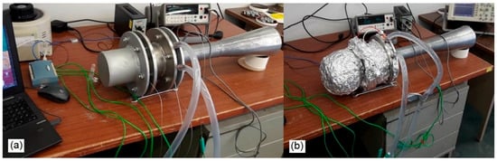 A picture of the standing wave engine in place for testing without and with thermal insulation (rock wool) is shown in Figure 5a,b respectively.