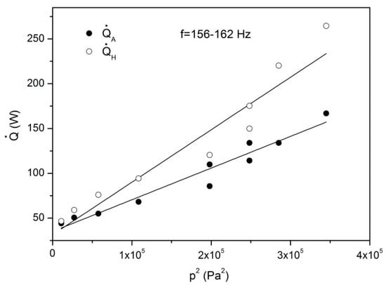 The heat introduced by the heater and extracted by the ambient heat exchanger with rectangular pores as a function of the square of the acoustic pressure.