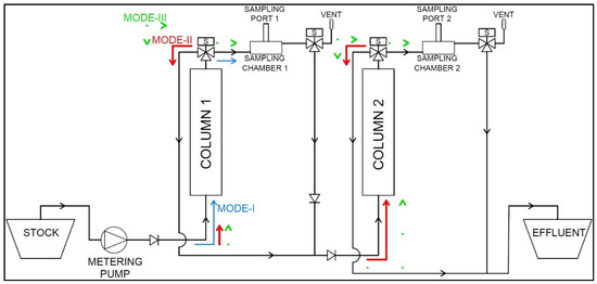 As a dual-stage system, the two columns are connected in a serial-flow arrangement, such that the first column receives the original stock with a higher HMI concentration and the second column receives the effluent from the first column. The upflow configuration ensures an overall better quality of flow, with a low liquid hold-up and a good stock feed distribution across the column cross sectional area. In contrast, for the downflow mode, an increase in pressure drop and flooding of the column bed is more probable [28]. Consequently, the stock is fed in an upflow direction to ensure proper and thorough distribution to the column beds and to minimize the need for backwashing and head loss effects.