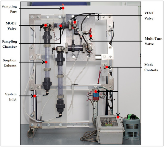 Another critical component to the design is the sampling method, and how to maintain continuous flow through the system while sampling the effluent of both columns. Due to the relatively slow feeding rate, the time to collect the desired sample volume for dilution and ICP-AES analysis would require residual sample volume and minutes of valuable contact time. Three-way solenoid valves (No. 00457979, 0124-C, 1/8-FKM-PP, NPT-1/4, max 145-psi, 24-V, 60-Hz, 8-W, 38-mL; burkert; Ingelfingen, Germany) are implemented to ensure that while a sample volume is collected at the desired sampling time, both columns would still be fed continuously. The MODE valves and custom fabricated rotating 30-mL sampling chambers are attached to the top exit of each sorption column, with accessible sampling ports. A second three-way solenoid VENT valve is included at the exit of each sampling chamber to introduce an air vent to assist in rapid sample extraction by preventing vacuum pockets within the sample chamber and discharge tubing. A multi-turn valve is included at the exit of the vent for the first column to introduce minor back pressure similar to that of the second column, so as not to alter the flow characteristics through the first column. Check valves are placed at critical locations throughout the hydraulic circuit to prevent back flows.