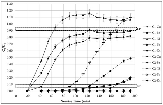 The breakthrough curve is displayed in Figure 3, as a plot of the solute outlet concentration () from Table 6 normalized to the inlet concentration () [34]. This normalized ratio trend over the service time of analysis [12,25] at which the sampling chambers (SC1, SC2) are extracted is presented for each of the five (5) HMIs combined in the multi-component solution; for both the first sorption column (C1) and second sorption column (C2). The breakthrough point (BP) and exhaustion point (EP) of each HMI in each column are indicated. The first observation to be had is that the breakthrough curves of the first column C1 do not have a defined S-shape. However, in the second sorption column C2, the curves take on this typical shape. Vukojevic Medvidovic et al. [34] points out that the shape-change may be attributed to an improved solid-solution phase contact for sorption to take place.