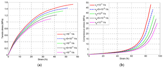 Figure 1. (a) Tensile and (b) compressive stress–strain curves for five different deformation rates.