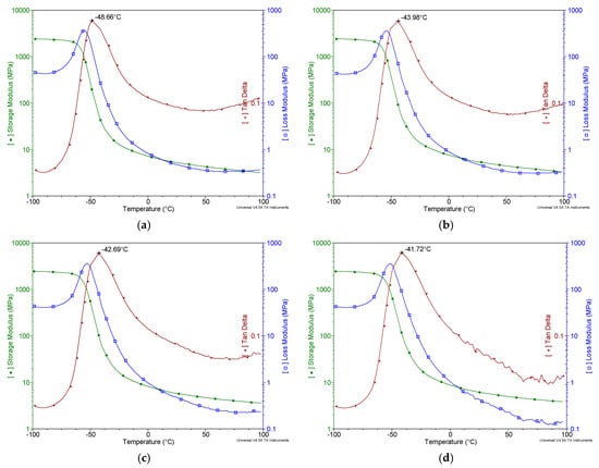 The DMA tests were carried out using TA Instruments Q800 Dynamic Mechanical Analyzer (TA Instruments, New Castle, DE, USA). The beam samples (60 × 10 × 4 mm) were clamped at one end (single cantilever mode) and subjected to constant oscillating deformations over a temperature range of −100 to 100 °C for four different excitation frequencies: 1, 2, 5, and 10 Hz. The excitation amplitude was set to 20 µm, and the heating rate to 3 °C/min. The plots of the storage modulus, loss modulus, and the tangent of the phase angle over a wide range of temperatures for four different excitation frequencies are shown in Figure 2.