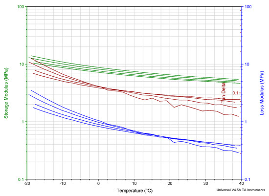Figure 3. DMA results for all excitation frequencies in the temperature range from −20 to 40 °C.