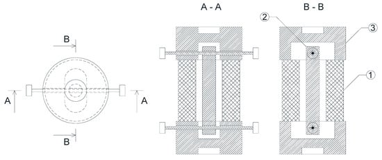 Figure 4. Technical sketch of the polymeric bearing (PB) (1: polymer cylinder with a centrally located hole, 2: pin-ended steel core, 3: anchor plate).