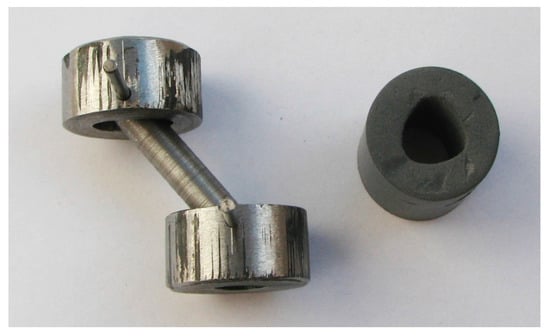 A prototype PB considered in this research is made up of a polymer cylinder measuring 28 mm in diameter and 28 mm high with a centrally located hole (14 mm in diameter) into which a pin-ended steel core (6 mm in diameter) is inserted. Two additional steel anchor plates measuring 30 mm in diameter and 15 mm high were mounted at both ends of the polymer cylinder. The total height of the PB is 58 mm. The basic components of the prototype PB are shown in Figure 4 and Figure 5. The prototype solution ensures that the steel core sustains vertical forces, while the polymer cylinder is subjected to shearing. In that way, the steel core prevents the polymer cylinder from carrying vertical loads that could possibly lead to undesirable bulging of the bearing. The maximum horizontal displacement of the PB is about 100% of its total height, which—when compared to HDRBs and LRBs—is a relatively high value. More importantly, the damping coefficient of the PBs calculated based on the experimentally obtained hysteresis loops ranges from 20% to nearly 50%, while, for most commonly used seismic isolators, the damping ratio is approximately from 10% to 20%.