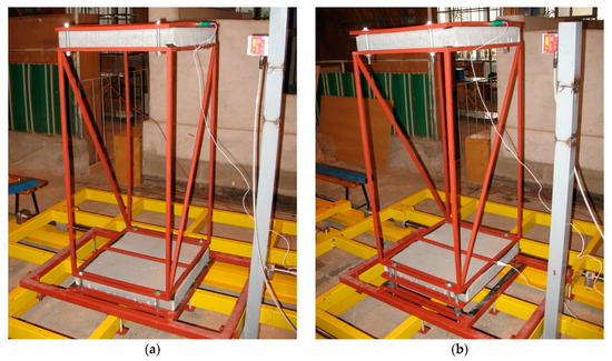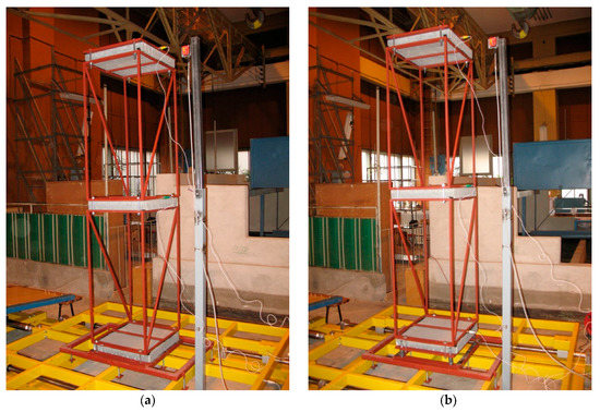 In order to conduct the experimental investigation, a single-storey and two-storey structure models were prepared. The welded steel frames were constructed using the rectangular hollow section elements (RHS 15 × 15 × 1.5 mm). The columns were arranged in a rectangular pattern with spacing of 0.465 m in the longitudinal direction and 0.556 m in the transverse one. Diagonal bracing was used in the sidewall planes to counteract transverse and torsional vibrations. Moreover, concrete plates (50 × 50 × 7 cm) were employed to simulate the weight of the floor and foundation slabs. The welded steel frames were clamped together using M10 bolts. The single-storey structure model consisting of one steel frame and two concrete plates is 1.20 m high and weighs 95.12 kg, whereas the two-storey structure model consisting of two steel frames and three concrete plates is 2.30 m high and weighs 148.04 kg. The dynamic behaviour of these two experimental models, both fixed-base and base-isolated, was extensively studied during shaking table tests. The structure models with and without the PBs are shown in Figure 7 and Figure 8.