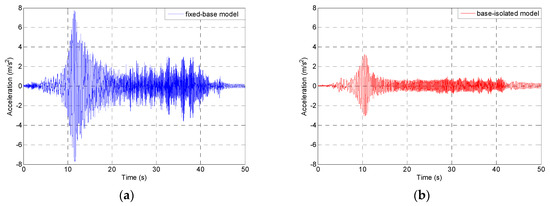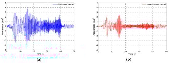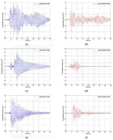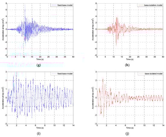 Figure 11. Time-acceleration history plots for the fixed-base (blue) and base-isolated (red) single-storey model during different earthquakes: the 1940 El Centro earthquake (a,b), the 1971 San Fernando earthquake (c,d), the 1989 Loma Prieta earthquake (e,f), the 1994 Northridge earthquake (g,h), and the 2002 Polkowice mining tremor (i,j).