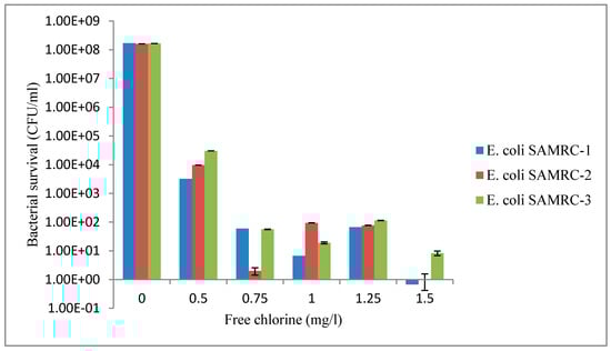The survival of the test E. coli isolates at the recommended free chlorine concentration of 0.5 mg/L indicates a compromise of water quality as the survival of E. coli in chlorine treated water signifies the existence of other microbial pathogens [21] and is a threat to public health and environmental safety.