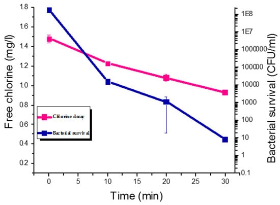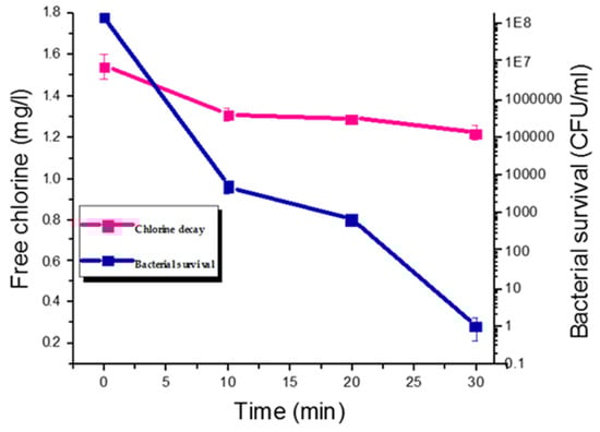Chlorine decay and inactivation of E. coli SAMRC-1 at 1.5 mg/L during 30 min exposure. Bacterial survival and chlorine decay were quantified at 10 min interval. The error bars represent standard deviation from the mean, n = 3.