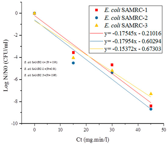 The disinfection kinetic parameters of E. coli at higher chlorine concentrations were determined by fitting inactivation data to the Chick–Watson empirical model [43]. The empirical logarithm equation was expressed as: