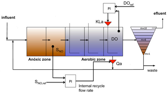 The default control strategy proposed in the BSM1 (Figure 1) consists of two PI loops: (1) control of the dissolved oxygen concentration in the fifth reactor (SO5) manipulating the oxygen transfer coefficient KLa5, and (2) control of the nitrates concentration in the anoxic zone (SNO2) manipulating the internal recycle flow rate Qa.