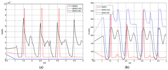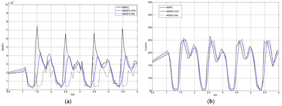 Both formulations of the economic oriented controllers are validated with three different sets of weights of the economic cost function (Equation (8)): w1 = 1, w2 = 0 (EMPC-OCI/HEMPC-OCI); w1 = 0, w2 = 1(EMPC-NH/HEMPC-NH); and w1 = 1, w2 = 1 (EMPC-OCI + NH/HEMPC-OCI + NH), and compared with the traditional NMPC described in Section 2.1.