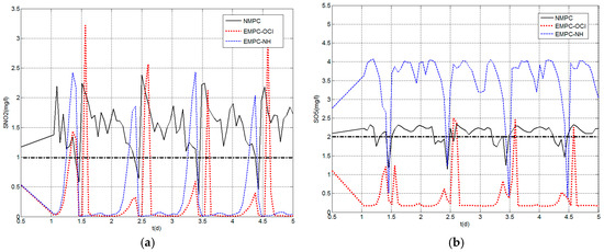For all controllers, the sampling time selected is τ = 5 min, after some trial and error study of this parameter. Some simulations have been performed with τ = 3 min, but this change does not improve results and the computational time increases considerably. On the other hand, considering τ = 15 min, which is an increment of the sampling time, might lead the control system not to capture the process dynamics properly, such as nitrates stabilization after some influent disturbances affect the process, for example.