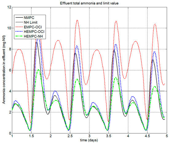 The evolution of the most relevant process variables along the operating horizon is presented in the following figures. First, the comparison between the standard NMPC, which is focused on the set-point tracking, and the HEMPC (HEMPC-OCI: w1 = 1, w2 = 0, HEMPC-NH: w1 = 0, w2 = 1) is presented. The controlled variables are shown in Figure 4, and the corresponding control signals (manipulated variables) are shown in Figure 5. The NMPC exhibits an acceptable set-point tracking even though an offset is observed, especially in the nitrates concentration (SNO2). Although better set-point tracking could be attained using more elaborated techniques to deal with the plant–model mismatch problem, it is not a critical issue because the objective of the proposed control strategies is to improve the economic aspects in the operation. In the operation under HEMPC-OCI, the SNO2 and SO5 responses present higher variation between the operational limits than the NMPC and HEMPC. The evolution of the control inputs with the different controllers is presented in Figure 5, where it is possible to see that the weights given to the economics in JECO (Equation (8)) in the controller algorithm significantly affect the control signal. The recycle flow (Qa) is especially affected, showing more intensive movements in the NMPC in order to reach the set point than in the hybrid controllers. In the case of the HEMPC-OCI, a lower recycle rate minimizes the pumping energy. In the case of HEMPC-NH, it could be interpreted in the sense that the lower values of the recycle are favorable for ammonium elimination. A similar trend is appreciated in the aeration energy, but in lower magnitude.