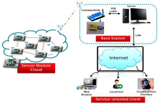 Basically, the developed system consists of the sensor module cloud (SMC), base station and service-oriented client, as shown in Figure 1. The sensor module cloud (SMC) contains collections of sensor modules that measure the air quality data and transmit the captured data to the base station through a wireless network. Each sensor module includes an integrated sensor array that can measure IAQ parameters. There are various IAQ parameters involved in measuring the IAQ level. These parameters are divided into four categories: physical condition, chemical contaminants, biological contaminants, and other common IAQ parameters. However, for the purpose of this project, only nine parameters have been chosen, which are nitrogen dioxide (NO2), carbon dioxide (CO2), ozone (O3), carbon monoxide (CO), oxygen (O2), VOCs and particulate matter (PM10) along with temperature and humidity. This study chooses the parameters for its IAQMS based on the indoor air parameters highlighted by the Occupational Safety and Health Administration (OSHA), the American Society of Heating, Refrigerating and Air-Conditioning Engineers (ASHRAE), the United States Environmental Protection Agency (US EPA) and Malaysian regulations on indoor air as stipulated by Department of Occupational Safety and Health (DOSH) [12,17,31,32].