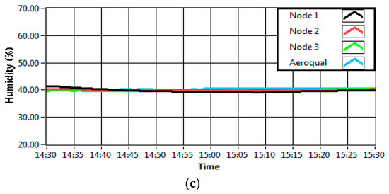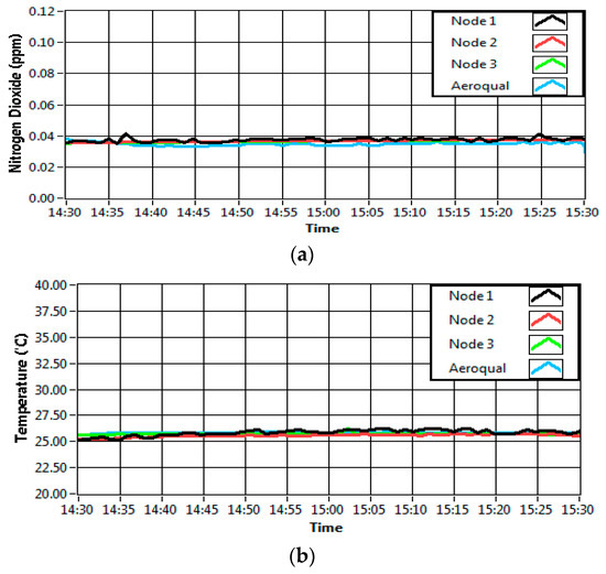 The calibration of each gas sensor has been carried out in our previous manuscript [35]. For validation, self-developed sensor nodes were validating with the commercial device. The validation procedure had been carried out to make sure that the data collected by the sensor was similar to the data collected by a commercial sensor. The discussion of this procedure was limited only to the NO2, temperature and RH sensors. High NO2 levels in the outdoor environment, originating from local traffic or other combustion sources, influences the NO2 level in the indoor environment. Exposure to an excessive level of NO2 could be fatal [4]. The sensor validation was carried out with an Aeroqual Ltd. (Auckland, New Zealand) Series 500 portable indoor monitor device (a professional grade air quality measurement system) which had been pre-calibrated [36]. Three sensor nodes and the Aeroqual device were placed in a clear, sealed glass container of 100 cm × 40 cm × 30 cm which was completely sealed. Then, the gas concentration inside the sealed container was varied by injecting the particular gas of interest. The outputs of the sensors were recorded continuously for 1 h and plotted (Figure 2).