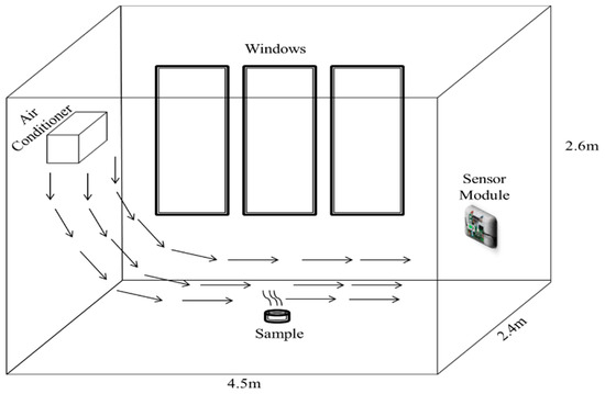 Once all the five conditions of sources of indoor air pollution were identified, an experiment simulating the five conditions was set up for data collection purposes. The experiment was conducted in medium-size room of 4.5 m × 2.4 m × 2.6 m located in a concrete building which is equipped with an air-conditioner at a height of 2.2 m from the floor, as shown in Figure 3. The building is located 100 m away from the main road, which is relatively far from traffic-related outdoor air pollution. In addition, the location of the building is basically in a rural area, which eliminated the influence of urban air pollution on the ambient air. Thus, the ambient air measured during the experiment is not highly influenced by the outside air itself. The room was a closed environment and sealed by using rubber-seal windows. The sensor module, which is used to collect the data on the indoor air, was installed hanging up to the right of the wall of the room with a 1.1 m height above the ground; a position considered as the breathing zone for the occupants [10]. The sensor module was powered using a 7.5 V adaptor and was programmed to send the data to the base station every one minute. The data collection was conducted over 16 days between 9:00 a.m. and 5:00 p.m. with the room temperature set at 22 °C. After each experiment, the window was opened to purge the indoor air as well as to allow outside air to enter the room. Since the ambient air essentially served as a baseline for the experiment, the pollutants of interest would vary each day based on the outside ambient air concentrations that day. Since the ambient air essentially served as a baseline for the experiment, the pollutants of interest would vary each day based on the outside ambient air concentrations that day. This variation can be accounted for by using data pre-processing techniques such as baseline manipulation. Baseline manipulation is the solution to the problem and the correct way of representing the signal when the analysis deals with sensor values from different conversion units. Baseline manipulation helps to pre-process the sensor output to free itself from the drift effect, the intensity dependence and, possibly, from non-linearity [40,41]. The details about other type of data pre-processing techniques will be described in the next section.