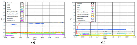 The sensors are chosen based on their detection rate, which comply with the range required by IAQ [10,12]. Each sensor generates a voltage signal based on the current environment. These sampling voltage levels are read by the microcontroller periodically. Selecting a proper gas sensor is a relatively complicated issue, as many factors need to be taken into consideration. For this study, most of the gas sensors are metal oxide (MOX)-based, while the rest are electrochemical-based. The MOX gas sensor is composed of a sensor cap, sensing element and sensor base. Basically, the gas sensing element is coated with a metal oxide—tin dioxide (SnO2)—material that responds to the gas molecules, which are typically volatile compounds [33]. It consists of two major parts; namely, the heater and sensor substrate. The substrate has two terminals, and its resistance is measured as a representation of the amount of gas concentration in the environment, while the heater provides the stabilized temperature needed for the measurement [34]. Due to its long lifetime, high sensitivity response and low cost, this type of sensor is commonly used in many indoor applications such as homes, offices and factories appliances. The second type of gas sensor used in this study is the electrochemical-based sensor. This type of sensor has high sensitivity to environmental change and it does not need power to operate. The typical electrochemical sensors consist of chemical reactants (electrolytes or gels) and two terminals—an anode and a cathode. The anode is responsible for an oxidization process and the cathode is responsible for a reduction process. As a result, current is created by way of positive ions flowing to the cathode and the negative ions flowing to the anode. The output is directly proportional to the concentration of the sample gases.