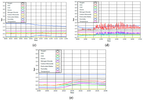 Meanwhile, for the last condition, 30 min of data were recorded instead of 8 h because the effects of cigarette smoke only last for 30 min. Figure 4e illustrates the effect of the cigarette smoking activity on the sensor in the room. Notably, in all graphs, a different set of gas sensors reacted differently towards different conditions.