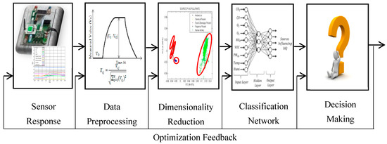 The multivariate response of an array of chemical gases with broad and partially overlapping selectivity created “electronic fingerprints” for a wide range of odour which can be characterized using pattern-recognition. The process of pattern recognition may be split into four sequential stages: data pre-processing, dimensionality reduction, classification and decision making. Figure 5 illustrates the pattern recognition process. Each stage is described in detail in the following sections.