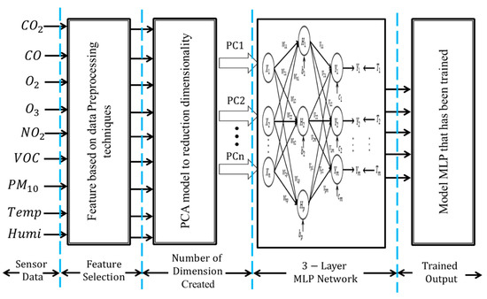 The detailed parameter for MLP training is given in Table 9. For example, to train the dataset (before PCA) for the condition of ambient air, the data from all 9 IAQ parameters become the neurons for the input layer. Randomly, 60% of each IAQ parameter was selected to be the training set (60% out of 960 data for ambient air). The training was conducted until the targeted MSE was reached or until a maximum epoch limit of 1000 was reached. This process was repeated with the other four conditions. In the end, the network would produce a model which was then tested against the 40% of the remaining data for all conditions (the testing set) in order to find the classification accuracy. The whole process was repeated again for different features. The model of the feature that gave the highest classification accuracy may be chosen to be embedded into the system after being compared to the model of other type of classifiers, such as KNN or LDA.
