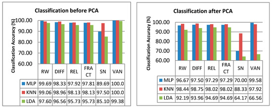 The classification performance of the MLP, KNN and LDA using the six features for the dataset before-PCA and after-PCA are shown in Figure 8. The PCA was performed because PCA is known to be able to increase the classification accuracy of certain datasets by reducing the number of variables, losing only a minimum of variability [46]. However, as shown in Figure 8, the classification rate for dataset after PCA is less than the classification rate before PCA for all features. This result is due to the information loss during PCA. According to [58], for datasets with very low complexity (few PCs), the relevant information has been excluded during the process of PCA, which resulted in a lower classification accuracy for datasets after PCA. The PCA could give a higher classification accuracy to datasets with very high complexity (many PCs), where the dataset before PCA does not only have relevant information, but also contains noise [59]. With the presence of noise, the classifier over-fits the training data and thus does not generalize well. Based on the explanation by [58], it can be seen that this study has a dataset with a very low complexity (only 9 PCs). Thus, the PCA process has excluded relevant information that could contribute to the high classification accuracy, which explains the lower classification accuracy for the dataset after PCA. Nevertheless, although the dataset after PCA (VAN feature) could not give 100% classification accuracy, it could classify 99.58% of the dataset using only two variables instead of nine variables needed for the dataset before PCA.