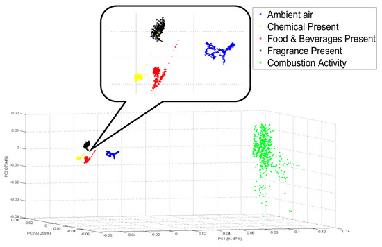 The experiment began with the first condition present, which was the ambient air. There were 45 samples collected for ambient air over 45 min duration. This environment was tagged as “single source”. Then, an automatic air freshener which released fragrance every 15 min was placed inside the room. This environment was conducted to simulate the presence of two sources: ambient air and fragrance. The air freshener was hung up on the wall with a height of 2 m from the floor and about 2 m from the sensing node. Total data collected for the air freshener was over 75 min. This environment is tagged as “mixed sources A”. After that, a person was asked to smoke in the room. This environment was conducted to simulate the presence of three sources of IAP: ambient air, fragrance and single cigarette smoke. That person smoked one cigarette at the centre of the room. One cigarette took 10 min, which contribute to a 10 min data sample. This environment was tagged as “mixed sources B”. Lastly, the other two sources of IAQ, which are food and beverages and chemical cleaning product, were added into the environment. These two sources of IAP were placed in the middle of the room for 20 min, which gave 20 samples. This environment was conducted to simulate the presence of all five sources of IAP. Although there was no person smoking in the room at this time, the presence of smoking can still be traced. The presence of smoking can be traced up to 30 min, as shown in Figure 10. This environment was tagged as “mixed sources C”.