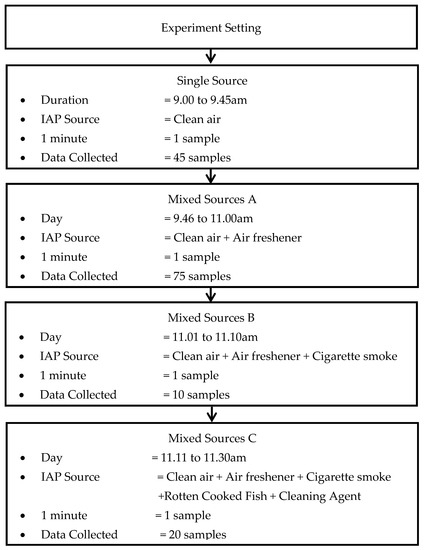 Higher IAP levels could lead to certain health effects, while extremely high IAP levels could be fatal. Different IAP parameters may come from different sources and impose different health effects towards humans, as shown in Table 3. Table 3 shows that there are certainly a lot of activities and conditions which could trigger IAP, such as air fresheners, combustion appliances, water damage, cigarettes, fire and combustion equipment [10,12,13]. However, for the purpose of this study, the sources of IAP are limited to five conditions only, because they are commonly present in the indoor environment: ambient air, combustion activity, the presence of chemical products, the presence of food and beverages, and the presence of fragrances [17,37,38,39]. The first condition of sources of indoor air pollution is the ambient air. Ambient air refers to the air that normally exists in the indoor environment without the presence of other sources of indoor air pollution. Ambient air could pollute the indoor air if it carries excessive dust from carpets and furniture or if it carries too much ozone from office machines [17]. The second condition of sources of IAP is combustion activity. Combustion activities such as smoking cigarettes and burning fire-wood release poisonous gases such as CO and CO2, and PM at a higher concentration than ambient air does, which could harm human’s health [37,39]. For the purpose of this study, cigarette smoking has been chosen as the proxy for combustion activities. The third condition of sources of indoor air pollution is the presence of chemical products or substances. Chemical products such as chemical cleaning agents which are usually used in homes and offices may release VOCs at a poisonous level. Excessive level of VOCs may lead to respiratory-related diseases, such as lung cancer [17]. Thus, for the purpose of this study, chemical cleaning products will be used as the proxy for the presence of chemicals. The fourth condition for sources of indoor air pollution is the presence of food and beverages. Cooking activity or certain food and beverages emit VOCs which could lead to an uncomfortable smell inside a building [38]. VOCs are known to have led to eye irritation, headache and nausea in certain people. Therefore, rotten cooked fish, which has a strong smell and a high level of VOCs, is chosen as the proxy to food and beverages.