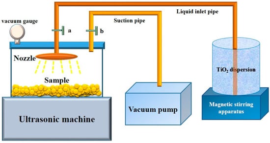 Ceramsite sand (CS) was activated by being immersed into 0.1 mol/L NaOH aqueous solution with sonication for 30 min to get more active sites. The other method for activating CS was to immerse CS into 5 mol/L NaOH at 85 °C in a reflux device for 4 h. Then, the activated CSs were put into vacuum saturation container at 0.1 MPa vacuum for 30 min to discharge the air in pores of CS. TiO2 (P25) was firstly dispersed in 100 mL absolute alcohol with magnetic stirring in various concentrations. After 30 min of vacuum pumping and magnetic stirring, TiO2 absolute alcohol dispersion solution was inhaled into the vacuum container with ultrasonic treatment for 1 h. Then, photocatalytic ceramsite sand (PCS) precursor was taken out, washed by distilled water, and dried at 105 °C for 3 h. PCS was thus successfully prepared. The concentrations of TiO2 absolute alcohol dispersion solution were designed as 1, 2, 3, 4 and 5 g/L, respectively. The samples were denoted as mPCS-n, where m was the coating concentration of TiO2 absolute alcohol dispersion (m = 1, 2, 3, 4, 5 g/L), and n was the particle size of CS (n = 0.1~0.6, 0.6~1.25, 1.25~2.35 mm). To compare PCM in this study with traditional photocatalytic cementitious materials, control groups were prepared in traditional ways by spraying TiO2 on the surface or incorporating into cement pastes with same amount of photocatalysts (0.1 g) and same dimension compared with other samples. The photocatalytic activity of pure TiO2 (P25) was also tested. The experimental devices and procedure are shown in Figure 1.