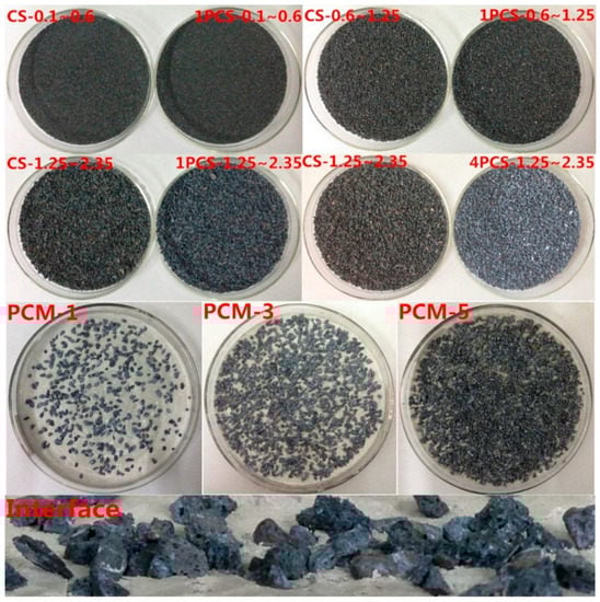 Figure 2 showed the surface morphology of CS and PCS with different particle sizes. The samples were denoted as CS-n and mPCS-n, where m was the coating concentration of TiO2 absolute alcohol dispersion (m = 1, 4 g/L), n was the particle size of CS (n = 0.1~0.6, 0.6~1.25, 1.25~2.35 mm). No apparent color differences were observed between CS-0.1~0.6 and 1PCS-0.1~0.6. In addition, 1PCS-0.6~1.25 was a little whiter than samples without coating. Nevertheless, all PCS of the particle size 1.25~2.35 mm were obviously whiter compared with the control samples without coating, which was consistent with Yang’s study []. The change of color was attributed to the light absorption and reflection of TiO2 particles []. As we can see, PCS with TiO2 dispersion solution concentrations 4 g/L were significantly whiter than that of 1 g/L, which was related to more TiO2 coating areas and thicker TiO2 coating layer. The surface topography of PCM with 1, 3, 5 g PCS loaded and interface between PCS and matrix are shown in Figure 2 as well.