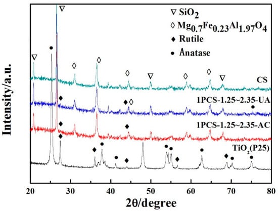 XRD patterns were applied to explore the crystalline structure of samples. Figure 3 showed the XRD patterns of CS, TiO2 (P25) and 1PCS-1.25~2.35 with ultrasonic activation (1PCS-1.25~2.35-UA) and alkali activated (1PCS-1.25~2.35-AC). It can be seen that the main components of CS were SiO2 and Mg0.7Fe0.23Al1.97O4. Comparing with the XRD pattern of TiO2, the characteristic peaks of 1PCS-1.25~2.35-UA occurred at about 2θ = 27° and 44.3° can be assigned to the Rutile []. The characteristic peaks at 2θ = 25.3° can be assigned to the Anatase. The peak of TiO2 could also be found in 1PCS-1.25~2.35-AC, but weaker than 1PCS-1.25~2.35-UA. The XRD suggested that TiO2 particles were successfully coated on the surface of CS and ultrasonic activation could get more actives sites for combination of CS and TiO2.