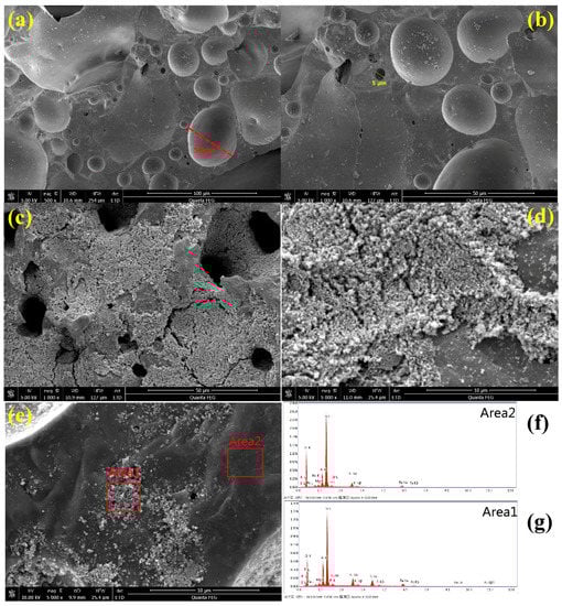 Surface morphology and EDS of CS and PCS; (a,b) surface morphology of CS-1.25~2.35; (c,d) surface morphology of PCS (4PCS-1.25~2.35); (e–g) surface morphology and EDS patterns of PCS (1PCS-1.25~2.35); EDS: energy dispersive spectrometer.