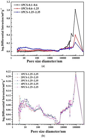 The pore distribution of all PCS samples; (a) 1PCS-n, (n = 0.1~0.6, 0.6~1.25, 1.25~2.35 mm); (b) mPCS-1.25~2.35, (m = 1, 2, 3, 4, 5 g/L).