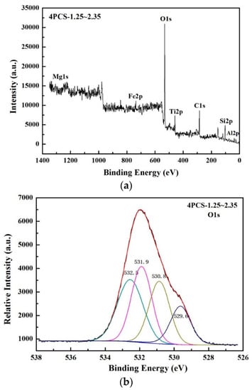 In order to further identify the chemical composition of PCS before and after TiO2 loading, XPS analysis was carried out. The XPS spectra survey patterns of Mg, Fe, O, Ti, C, Si, and Al peaks are showed in Figure 6a, indicating the elemental components and their chemical states of PCS, which are consistent with the XRD results. The C1s peak correspond to organic and inorganic carbon, which represent the pollution peak. The O1s characteristic peaks can be deconvoluted into four peaks at 529.6, 530.8, 531.9 and 532.5 eV, which can be assigned to Ti–O–Ti, Al–O–Al, Ti–O–Si and Si–O–Si, respectively []. The Al–O–Al bonds might be caused by the calcination of CS []. The bonding of titanium and silicon (Ti–O–Si) is supported by peaks centered at 531.6 eV, formed by the combination of Ti–O–H bond and Si–O–H bond. The binding energy of Ti–O–Si is 531.6 eV because the O1s binding energy of Si–O bond was weakened by the formation of Ti–O–Si and the electron density of Si is higher than Ti []. The formation of Ti-O-Si bond confirmed that TiO2 was loaded on the surface of CS by chemical bond, which is tighter than physical connection and could improve the catalysis durability of PCM effectively [].