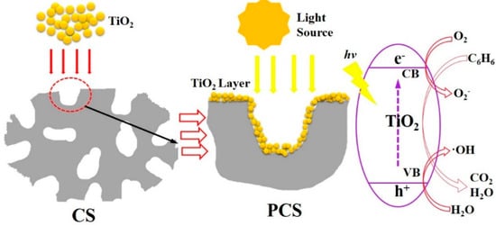 The photodecomposition process by PCSs is summarized in Figure 7. Comparing with cementitious materials, the porous structure of PCS could provide more gas diffusion and light transmittance channels which improved the reaction areas and utilization rate of photocatalysts. The photogenerated charges can generate “•OH” radicals and “O2−” intermediate species by reacting with absorbed H2O and O2 molecules for the photodecomposition of benzene. The mechanism of photocatalytic reaction is shown as follows []:
