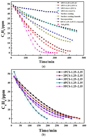 Photocatalytic activity of PCS to benzene; (a) 1PCS-n-UA (PCS with ultrasonic activation, n = 0.1~0.6, 0.6~1.25, 1.25~2.35 mm), 1PCS-1.25~2.35-AC (PCS alkali activated), surface coating (the mortars with TiO2 on the surface), surface coating-1month (the mortars with TiO2 on the surface after 1 month of atmospheric environment exposure), Incorporation (the mortars with TiO2 incorporated) and TiO2 (P25); (b) different TiO2 coating concentrations.