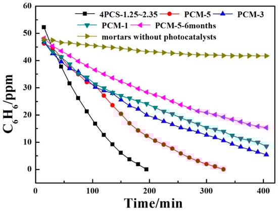 Photocatalytic activity of PCM and mortars without photocatalysts to benzene; PCM-1, 3, 5 (photocatalytic cement materials with 1, 3, 5 g 4PCS-1.25~2.35).