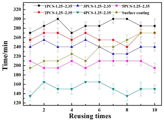 The resusability performance of catalyst is also an important parameter to evaluate the long-term catalytic performance of photocatalytic material in practical application. Figure 10 showed that time of fully degradation of 2 μL benzene by PCS with different TiO2 concentrations and control group. All PCSs still presented excellent photocatalytic activity after being reused for 10 cycles. This might be due to the good stability of substrate and the large bonding force between TiO2 and CS. The control group (Surface coating) showed decreased photocatalytic effects during the cycle experiment. This might be because that high surface energy of TiO2 and low specific surface area of mortar caused the agglomeration of TiO2 particles, which could lead to more recombination of electron-hole and difficulties for TiO2 particles to be exposed to the photocatalytic reaction. Comparing with the previous studies [,], our material had an excellent long-term photocatalytic performance with higher retention rate for photocatalytic activity. The reason was that the structures of porous PCS provided higher specific surface area and more gas diffusion channels than cementitious materials and prevented TiO2 particles from being affected seriously by the envelope of cement hydration products and the carbonation of cement [], which improved the reacting areas, utilization rate of catalysts, and enhanced the photocatalytic activity effectively.
