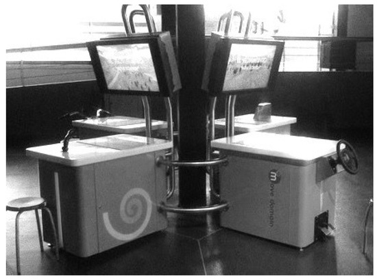 After analysis of the different exhibition modules, an interesting interactive module was chosen with features that allowed us to obtain the majority of the parameters to analyse in the research. The name of the exhibition module chosen was “Move Domain”. The educational experience involved users interacting and playing with one of four objects (car, plane, bike, or balloon), which were displayed simultaneously on four separate screens, demonstrating the four different methods of moving in the simulated virtual world. Users were able to have the experience of using all four transportation means; they were able to interact in the virtual world and see how other users travel and interact around the virtual world. The exhibition’s objective was to allow users to develop hand-eye coordination skills and spatial orientation using technology. The content was based on eye coordination and interaction with electronic games, with the exhibition’s message being “I can learn about virtual reality through playing”. The suggested number of users allowed at the same time was four.