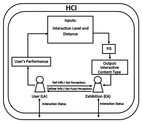 In our research, we define HCI as interactive museum elements composed of two principal actors: user (LA) and exhibition (EA). Through their performance (distance and interaction level), the user (LA) is evaluated by fuzzy perceptions of the exhibition (EA), obtaining (using the proposed FIS) the adequate interactive content type, ensuring the user’s interest is maintained and avoiding the interruption factor. These agents have direct communication, constantly requesting and receiving information. The exhibition (EA) contains all information of the interactive exhibition it can collect through sensing using fuzzy perceptions; it can sense the performance data (interaction level and distance) of the users (LA). Interaction level and distance operate as feedback data to be processed by reasoning of FIS to offer the adequate interactive content type to help and increase the interaction quality experience of the user (LA), maintaining attention for the exhibition and avoiding the interruption factor.
